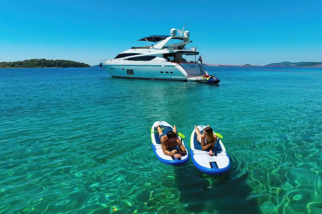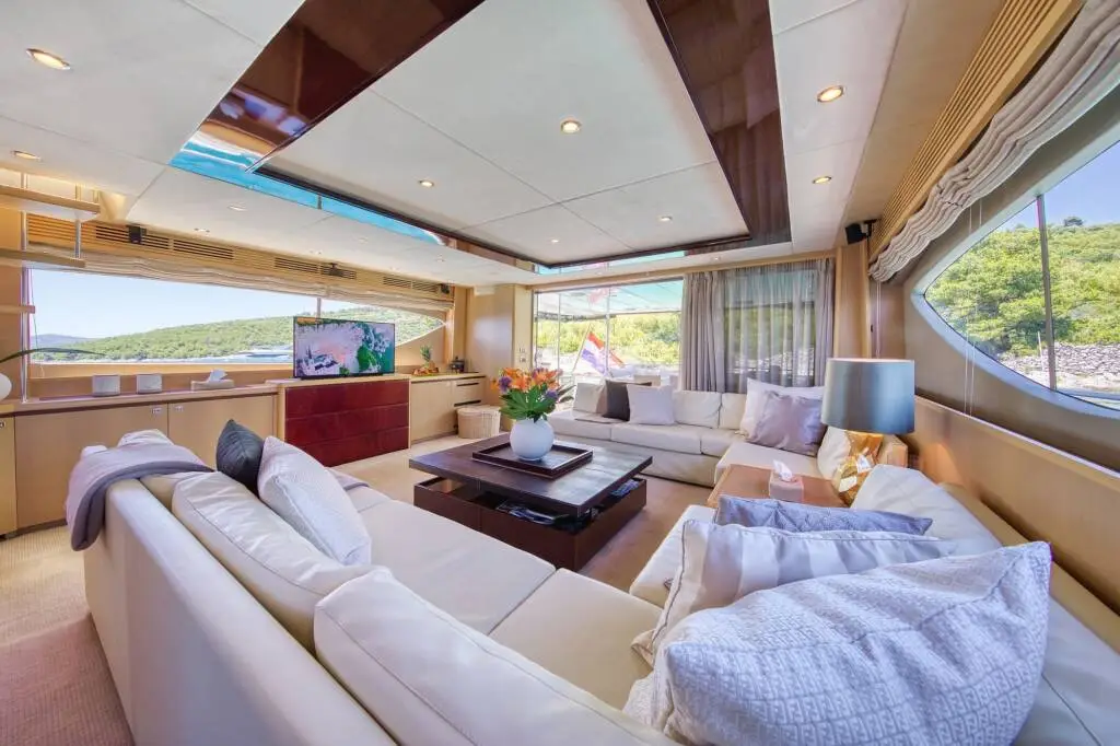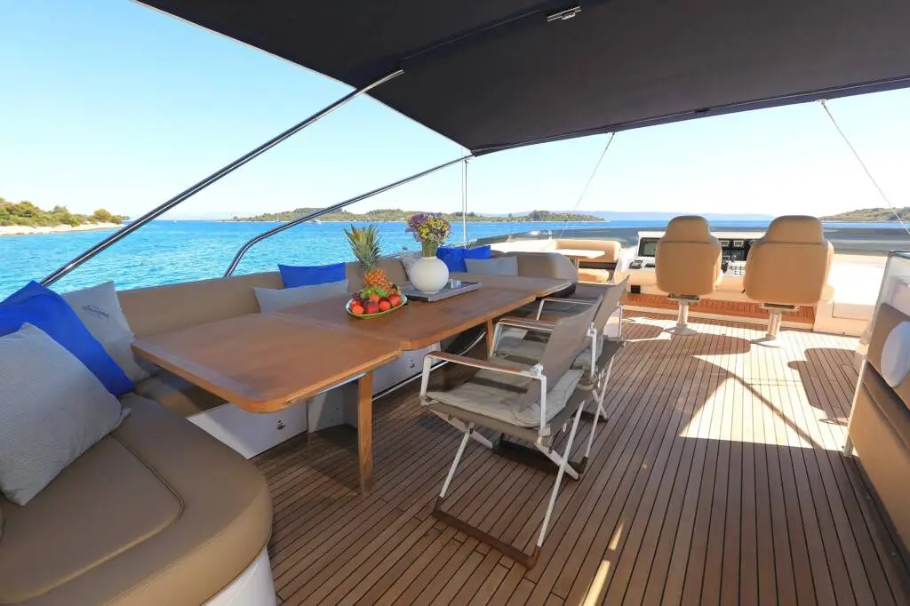 Princess 85 Fly is one of the largest yachts of her size, being built with impeccable quality by famous British Princess Yachts shipyard in 2009. She has gone significant refit in 2020, making her ready to take charters in Croatia. She features large volumes, both in exterior and interior, enabling you to enjoy in the sun, al-fresco dining or in comfortable interiors. She features the full beam master cabin and two VIP cabins with double bed, while the fourth cabin has bunk beds. Her eternal decoration style is matched by rich selection of water toys, making her the perfect yacht for unforgettable cruising.